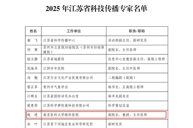 近日,江苏省科学技术协会正式公布2025年江苏省科技传播专家名单,南京医科大学附属眼科医院党总支书记、副院长姚进教授、李柯然副教授成功入选。眼科医院继蒋沁教授领衔的“江苏省眼科科技传播专家服务团”,评为2024年十大江苏省科技传播专家团队,又新增2名江苏省科技传播专家。